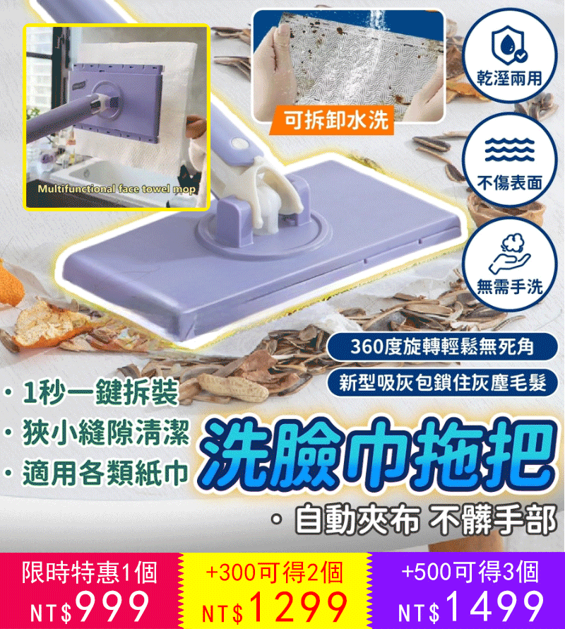 25分鐘前免手洗懒人伸縮拖把,新升級設計,不在擔心拖把不好弄,新升級長度設計,同時不沾手放人工擰拖把,使打掃變得簡單 - 【今日限定 買一送一 2把+ 拖布*2包 】-NT$999