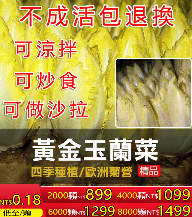 2分鐘前清脆可口的【黃金玉蘭菜】居然這麼簡單就可以種出來!生吃脆香甜,炒肉比肉鮮,輕輕鬆鬆幾個月就可以收穫,關鍵是年年可以割,年年可以長,年年有的吃 - 特大優惠!比利時「金玉蘭種子」4000顆(送狀根肥料)87%用戶的選擇!NT$1099
